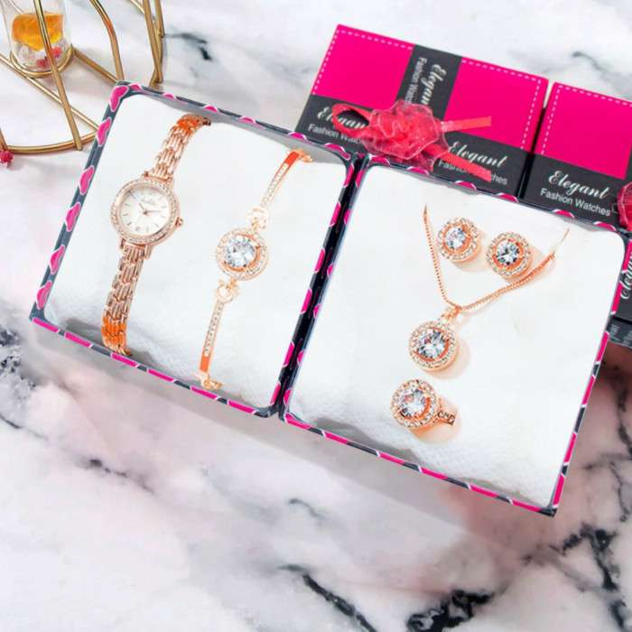 একটি সুন্দর গিফট সেট ১৪ ফ্রেরুয়ারি Valentine উপলক্ষে আপনার কাছে মানুষ কে গিফট করতে পারেন। ৫ পিচ সেট ১ টি বড় হাত ঘড়ি ১ টি বেসলেট ১ টি কানের দুল ১ টি গলার সেট ১ টি আংটি Model: 011TPrinted Treatment: Yes Particularities: Decoration Display type: PointerWorkable Persons: Female Style: Fashion Spring or not: none Waterproof: OK Waterproof: 30m waterproof life Type of movement: Quartz Thickness: 8mm Frame diameter: 24mm Stor type: onion watch crown Cas return type: Normal Mirror material: mineral reinforced mirror glass
